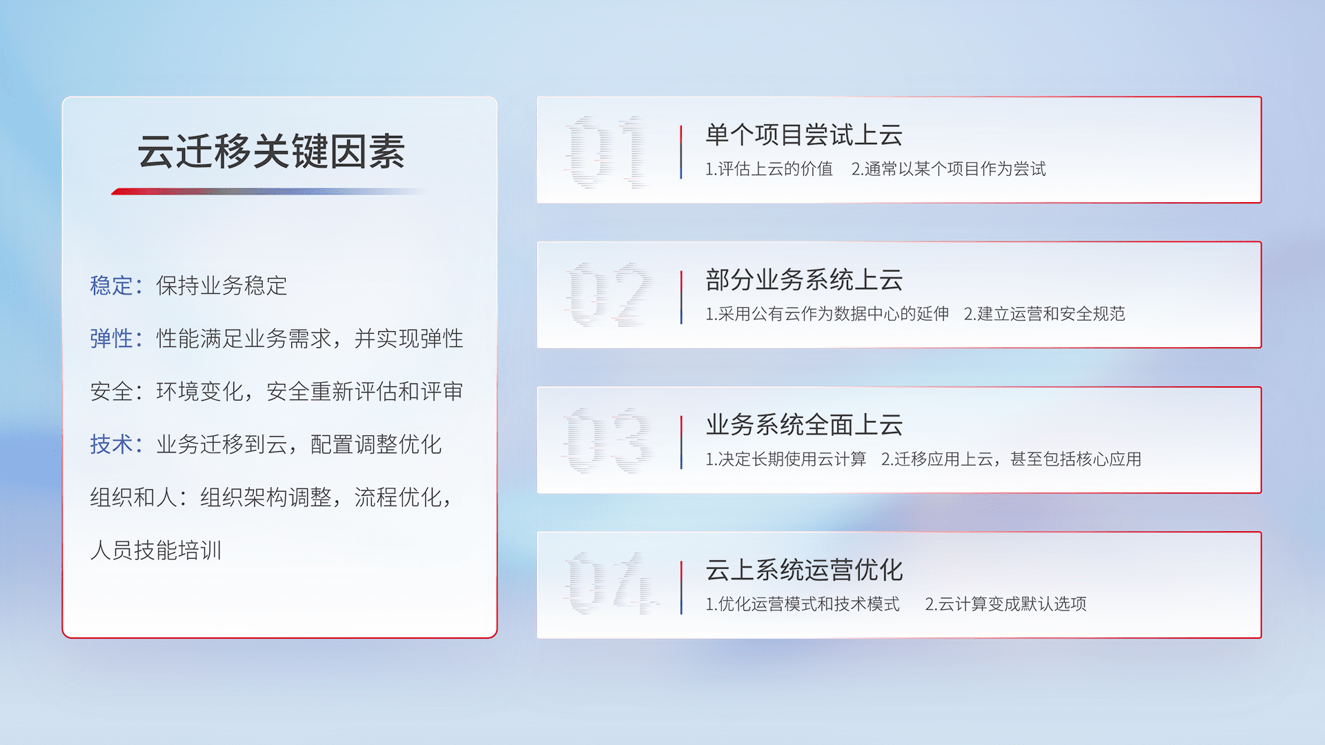 结合实际业务,,,,从规划设计、、、云平台选型、、、云原生改造、、、数据迁移、、集成交付,,,迁移全过程为客户识别最佳上云路径,,做好风险识别管理,,,设计网络架构、、身份权限、、安全审计合规、、、、操作审计、、、日志审计、、、、监控告警策略、、、多站点容灾设计等,,对云上基础设施进行整体规划,,,提升IT治理水平,,,以满足弹性、、、、高可用、、高性能的需求。。。。