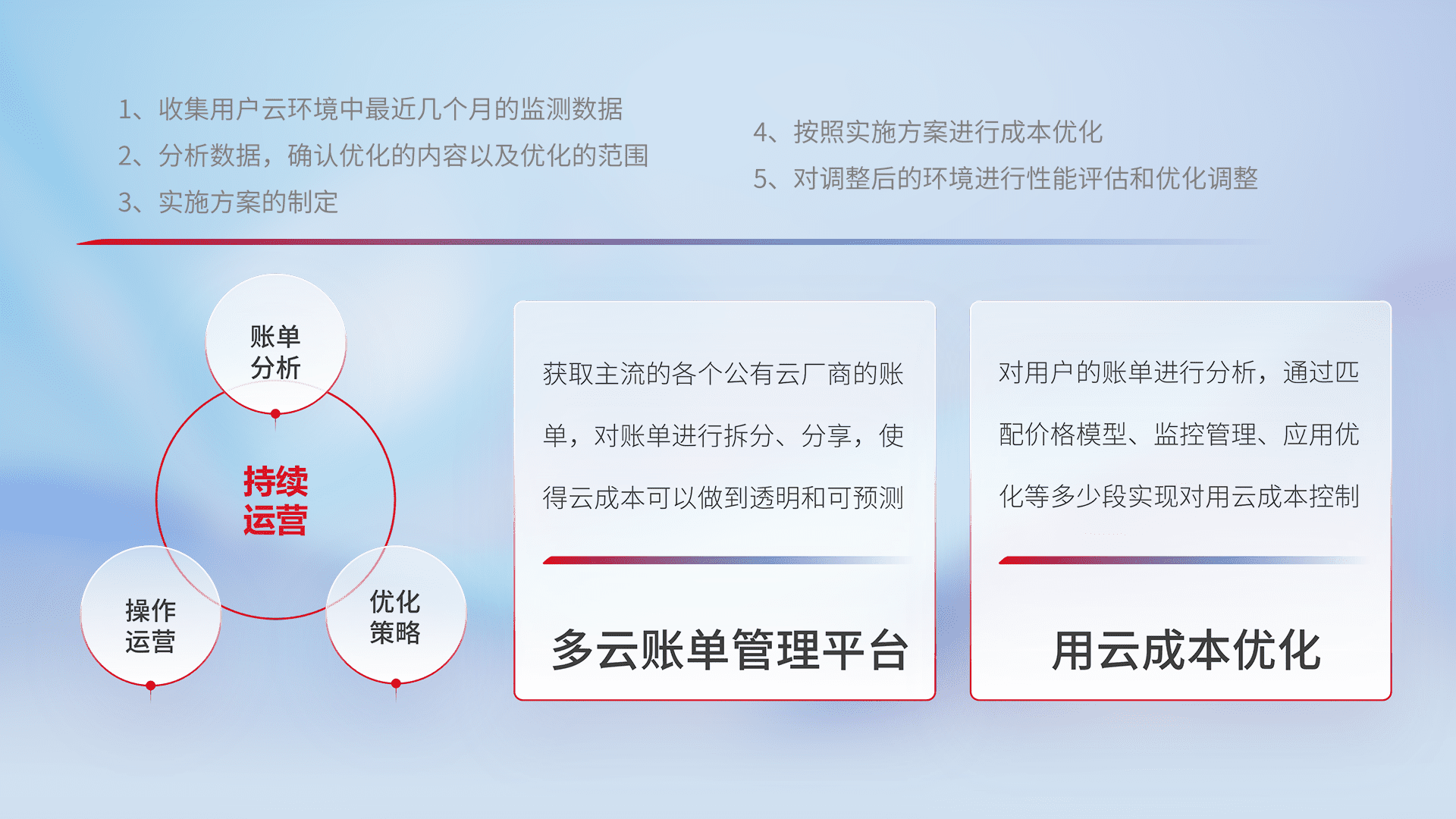 通过多云纳管,,以统一的资源数据模型把客户的云资源进行抽象和封装,,,,进而实现对多云资源的统一操作,,,保障云资源管理的可靠性、、、、稳定性与可用性。。量身定制化运维内容,,配置、、、、开发运维、、、补丁管理、、、备份、、监控、、、、认证和访问管理、、、、审计和日常巡检等,,,保障在用云过程中的可靠度,,,,稳定度以及高可用率。。。。